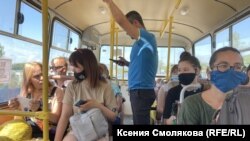 На автовокзале в Бийске пересаживаемся в старенький, ярко-синего цвета рейсовый автобус "Мерседес" до Горно-Алтайска. В нем невозможно дышать даже без масок, от ворсистых сидений еще жарче, в рюкзаке плавится плитка шоколада, но некоторые пассажиры не снимают защиту и в таких условиях. Тех, кто сидит без масок, водитель не одергивает, хотя уже несколько дней на Алтае усилены меры предосторожности из-за роста числа заболевших коронавирусом.