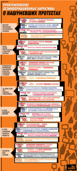 Собственно, большинство дезинформационных нарративов, направленных против народных протестов, были впервые введены прокремлевскими СМИ во время протестов на Майдане. Их изобразили как якобы «цветную революцию» и узурпацию власти, организованную и спонсированную Америкой и Европой, к которой подстрекали спецслужбы, которую разжигали неонацисты и русофобы, которая привела к экономическому и политическому хаосу.