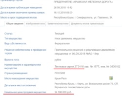 Федеральное государственное унитарное предприятие «Крымская железная дорога» инициировала около 50 аукционов по продаже имущества предприятия почти на 40 миллионов рублей, заявленных как начальная цена всех лотов.