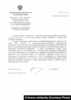 По ее словам, гражданские журналисты «Крымской солидарности» собрали целую папку письменных отказов со стороны российских судов, где они, ссылаясь на эпидемиологическую обстановку, отказывают корреспондентам в присутствии на заседании. Один из таких находится в распоряжении редакции (персональные данные корреспондента скрыты в целях безопасности – КР).
