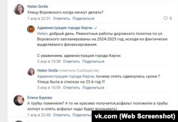 Керчане выражают возмущение в комментариях на странице соцсети «ВКонтакте» главы российской администрации Керчи Святослава Брусакова. Они обращают внимание на то, что сроки ремонта улиц сдвигаются, а новый асфальт кладут на старый прохудившийся водовод.