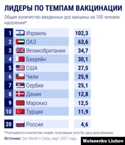 С конца 2020 года в некоторых странах началась программа вакцинации населения. Лидером по темпам вакцинации остается Израиль, который к 11 марта успел привить более 54% населения.