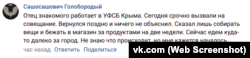 «Отец знакомого работает в УФСБ Крыма. Сегодня срочно вызвали на совещание. Вернулся поздно и ничего не объяснил. Сказал лишь собирать вещи и бежать в магазин за продуктами на две недели. Сейчас едем куда-то далеко за город. Не знаю, что происходит, но мне кажется, началось», – информирует членов сообщества пользователь под ником Сашосашович Голобородый.