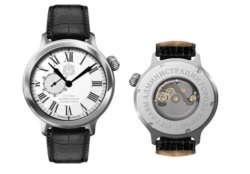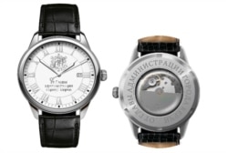 Мужские часы, согласно тендерной документации, сделаны из стали. Циферблат белый с позолоченной римской оцифровкой. Ремешок выполнен из натуральной кожи, пряжка на ремешке золотистого цвета.