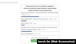 Примерно треть керчан высказались за то, чтобы использовать эту территорию возле центрального стадиона для занятий спортом, в том числе для детского спорта. Около 14% проголосовавших считают, что место для строительства отделения российского банка выбрано верно.