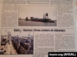 Например, рассказывается о сотрудничестве «Залива» с голландской компанией Damen Shipyards Bergum, для которой на заводе в Керчи изготавливали корпуса с последующей доукомплектацией судов. В частности, для голландской компании на «Заливе» построили судно CMM GRAVITY. Рассказывается и о контрактах на строительство корпусов судов для норвежской компании Ulstein.