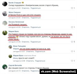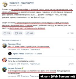 «С 5.30 не спим. Старый Крым. Слышно очень», – пишут пользователи в популярной феодосийской группе в российской соцсети «Вконтакте».
