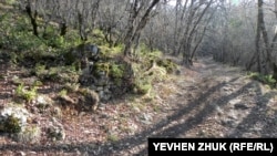 У пересечния дорог – беседка для отдыха и квартальный столбик, на этот раз бетонный, с номером 60. Мы продолжаем движение, никуда не сворачивая. Дорога влево выведет к Чернореченскому каньону, а если пойти направо, очутишься на серпантине старого Севастопольского шоссе, ведущего в Байдарскую долину.