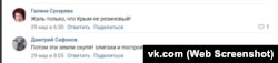 «Вот почему именно крымчанам? Там ребята воюют за Россию со всех уголков Родины. Может, паренёк из Сибири мечтает о семье и своей земле, там, в Крыму. Чем он хуже паренька из Крыма?» – пишет Наталья Любимая (Суходеева).