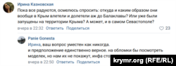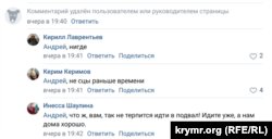 Многие комментарии удалялись администраторами сообществ «Вконтакте». Так, например, был удален комментарий севастопольца Андрея Василенко, но остались ответы других пользователей на его комментарий.