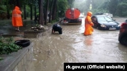Одну из пострадавших спасли сотрудники полиции. На фото, обнародованном пресс-службой крымского главка МВД России, видно, что девушку уносило потоком воды на улице.
