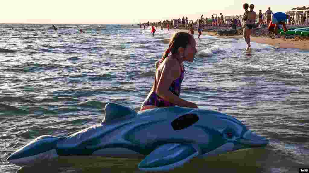Девочка с надувным дельфином на берегу Поповки (Сакского района).