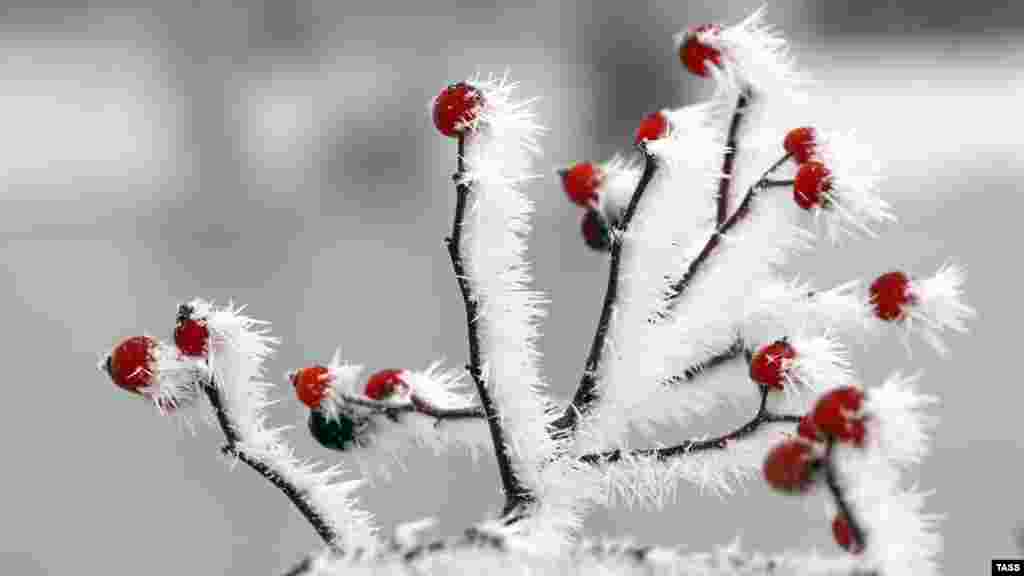 В Крым пришла настоящая зима: в Симферополе и Севастополе выпал первый снег. Ягоды шиповника у села Клиновка недалеко от Симферополя покрылись инеем.