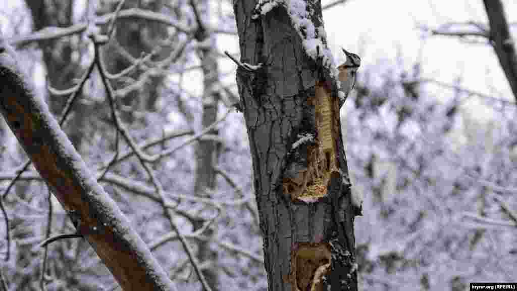 Дятел устроился на дереве в парке Мира в Симферополе.