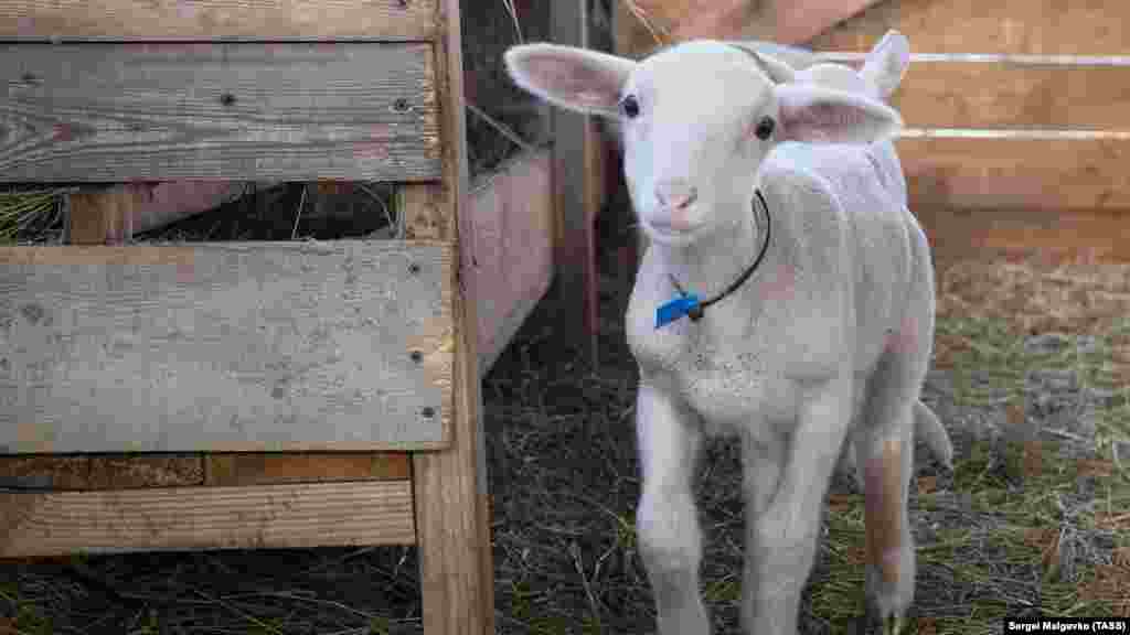 Ягненок на территории фермерского хозяйства в Белогорском районе Крыма. На частной ферме выращивают овец породы мериноланд и лакон, и производят несколько видов мягких и зрелых сыров.