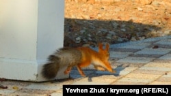 У колонны – рыжая белка, здесь их очень много. Посетители белок не обижают и подкармливают, но эта насторожилась, хотя я фотографирую с большого расстояния.