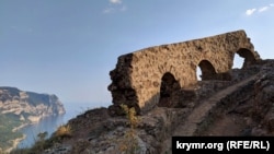 Остатки обоих мощных укреплений уцелели и после Второй мировой, несмотря на то, что после войны сооружения использовались как полигон для испытания авиабомб. Прогуляться к форту Южный – приятное и познавательное путешествие. Путь начинается с горы Крепостной, от развалин Генуэзской крепости Чембало. На фото – здания бывшей метеостанции, а между ними тропа, которая идет по оврагу Шайтан-Дере.