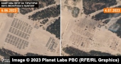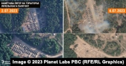Кроме того, на спутниковых снимках видно, что лагерь на полигоне Репище под Осиповичами начали убирать 3 июля. Его уже нет на снимке 4 июля. Как напоминает беларусская служба Радио Свобода, российские военные начали активно посещать полигон Репище под Осиповичами еще до начала полномасштабной войны против Украины. Там был большой госпиталь и много военной техники. До этого он то исчезал (лето 2022), то снова появлялся (30 октября 2022).