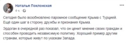 22 ноября днем российские СМИ со ссылкой на подконтрольного России директора автономной некоммерческой организации «Южный региональный центр поддержки экспорта» Наталью Серову сообщили о «возобновлении грузового паромного сообщения между Крымом и Турцией».