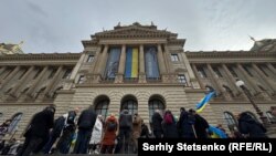В Праге группа протестующих собралась у здания чешского Национального музея и требовала снять украинский флаг со здания, который висит там с февраля 2022 года, сообщает корреспондент Радіо Свобода. Флаг был вывешен после начала полномасштабного вторжения России в Украину в знак солидарности.