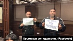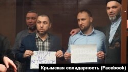 Фигуранты «дел Хизб ут-Тахрир» подняли в российском суде плакаты в поддержку Эдема Семедляева (+фото)