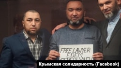 Фигуранты «дел Хизб ут-Тахрир» подняли в суде в Ростове-на-Дону плакаты в поддержку арестованного адвоката Эдема Семедляева. Об этом сообщили в гражданском объединении «Крымская солидарность».