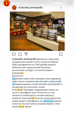 Ранее в соцсети Instagram была зарегистрирована страница mcdonalds_simferopol82, на которой анонсировалось открытие 10 марта ресторана McDonald's в одном из торговых центров Симферополя.