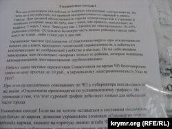 В Севастополе появились объявления с жалобами горожан на «несправедливое распределение электроэнергии» и призывами отправлять жалобы в различные инстанции: от местного штаба по противодействию чрезвычайной ситуации до президента Российской Федерации. В частности, такие объявления расклеены на подъездах домов в Гагаринском районе Севастополя.