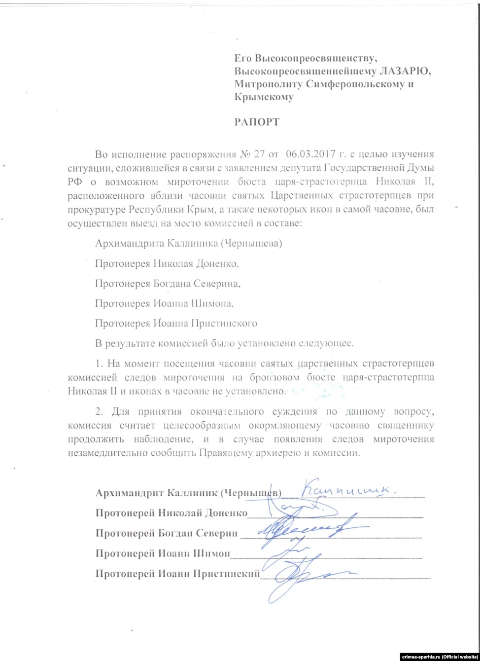 В Симферопольской и Крымской епархии утверждают, что специальная комиссия не обнаружила «следов мироточения на бронзовом бюсте царя-страстотерпца Николая II и иконах в часовне». Соответствующий рапорт обнародован на сайте епархии во вторник 7 марта.