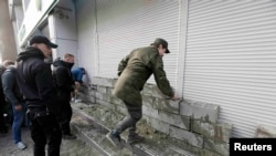 Активисты партии «Национальный корпус» и «Правого сектора» 13 марта пикетировали главный офис «Сбербанка» в центре Киева. Они замуровали центральный вход в банк бетонными блоками.
