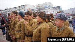 На площади имени Ленина в Симферополе 3 февраля прошел митинг, посвященный 75-летию Сталинградской битвы во Второй мировой войне. Участники митинга принесли с собой плакаты, флаги советского периода, государственные символы России, некоторые были одеты в военную форму Красной армии, пришли на акцию и девушки в сарафанах и кокошниках.