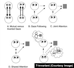 Человек учится понимать социальный сигнал постепенно. Сначала младенец учится находить и распознавать глаза и взгляд. Человек учится уверенно устанавливать визуальный контакт (пристальное смотрение) к 6–9 месяцам (картинка А). Но до 9 месяцев ребенок не умеет следовать за взглядом (картинка B), то есть нельзя, скосив глаза, указать ему на объект – необходимо повернуть голову. Следовать за одним только взглядом ребенок учится к полутора годам. Следующий этап развития – это объединенное внимание (картинка С): субъект А смотрит на объект и понимает, что субъект Б видит тот же объект. На картинке D изображен следующий шаг – разделяемое внимание: А и Б понимают, что они оба видят один тот же объект. Это первый шаг к взаимопониманию. Этому человек учится к двум годам.