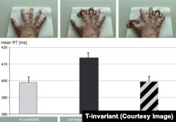 В некоторых случаях на картинках были изображены ладони, чьи пальцы придерживались металлическими скобками. В этих случаях испытуемые почти в два раза медленнее нажимали на кнопки. Даже несмотря на то, что их пальцы были абсолютно свободны, участники исследования ощущали скованность в движениях. Причем замедлялась только реакция тех пальцев, которые на рисунке были фиксированы.