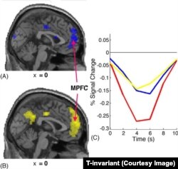 (А) Области возбуждения в мозге при переживании собственной боли (синие). (В) Области возбуждения в мозге при переживании чужой боли (желтые). (С) Уровень возбуждения при переживании своей боли (синий), чужой боли (желтый) и манекена (красный). Empathy examined through the neural mechanisms involved in imagining how I feel versus how you feel pain. Philip L. Jackson, Eric Brunet, Andrew N. Meltzoff, Jean Decety. Neuropsychologia 44 (2006) 752 – 761.