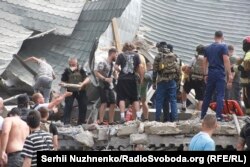 Спасатели и добровольцы пытаются быстро разобрать завалы над укрытием одного из отделений детской больницы «Охматдет», где находятся дети и медперсонал.