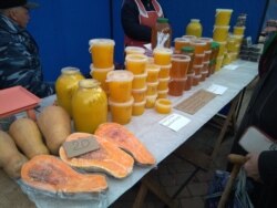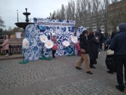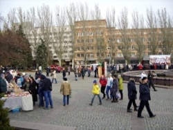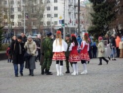 Впрочем, возле самовара с бесплатным чаем и блинами сразу же выстроилась очередь в несколько десятков человек. Те, кто ее выстоял, оставались ненадолго посмотреть на выступления народных ансамблей на сцене, которую соорудили рядом. Репертуар, естественно, русский – балалайка и танцы. Также, в честь нового «государственного» праздника тут же устроили ярмарку: колбасы, мед, рыбу, сладости, яйца и другие продукты тут можно было купить со скидкой до 5%. Немного, но для старающихся экономить на всем дончан все же приятно.