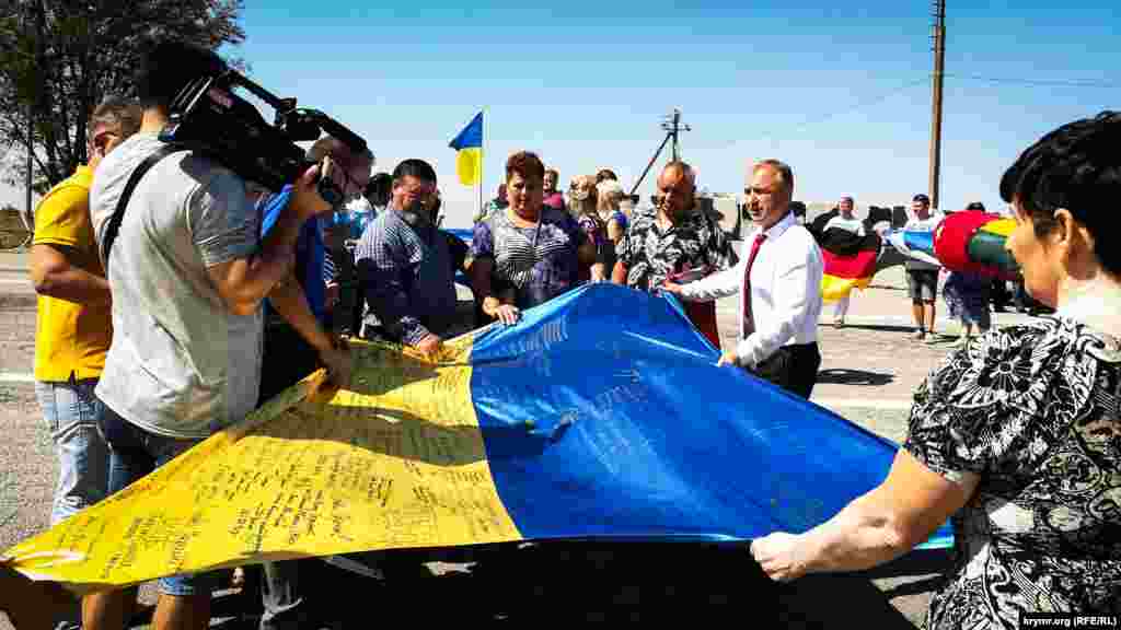 На административной границе с Крымом, возле КПВВ «Чонгар», активисты, в рамках международной акции «Объединенные флагом», развернули два украинских и один крымскотатарский флаг. На них поставили подписи и пожелания сотни украинцев, проживающих в разных странах мира.