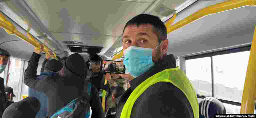 25 октября у здания Крымского гарнизонного военного суда в Симферополе собрались крымские татары, чтобы поддержать фигурантов красногвардейского «дела Хизб ут-Тахрир». Российские полицейские потребовали собравшихся разойтись, после чего сотрудники ОМОНа начали заводить собравшихся под судом в автобус. На фото один из журналистов ведет трансляцию из этого автобуса. 21 человек были задержаны и отправлены в отделение полиции.