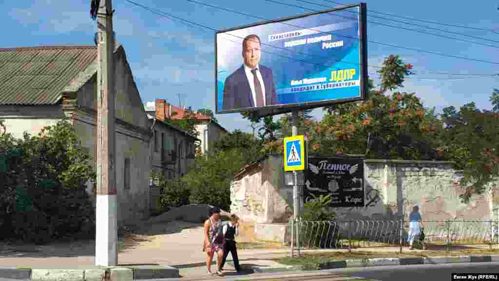 В разгар избирательной кампании на улицах Севастополя появились агитационные плакаты различных кандидатов. Однако, по словам корреспондента Крым.Реалии, лидирует среди них нынешний временно исполняющий обязанности российского главы города, а теперь и кандидат на эту должность Михаил Развожаев.