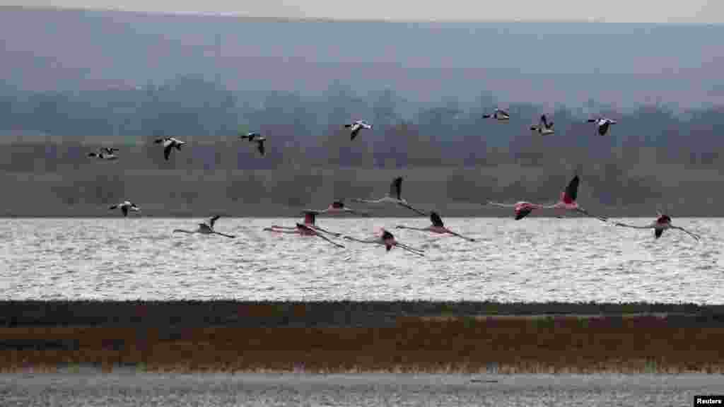 На побережье Черного моря у села Межводное, что в Черноморском районе Крыма, была замечена стая розовых фламинго.