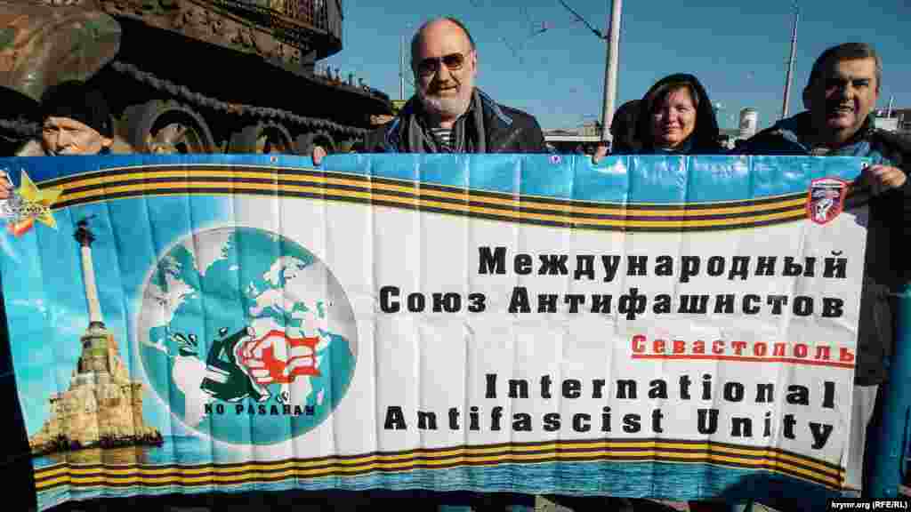 Позднее возле железнодорожной платформы с «трофейной бронетехникой» прошла акция представителей «Международного союза антифашистов Севастополя». Они развернули флаг Сирии и баннер с названием своей организации. По их словам, таким образом они протестовали относительно «распространения национализма и фашистской идеологии».
