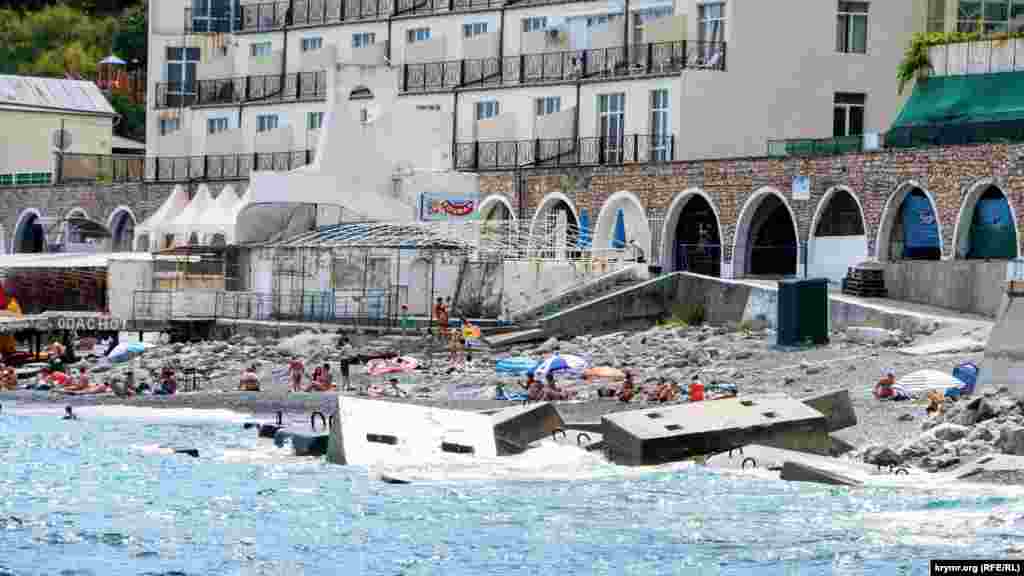 «Проход на причал закрыт» – такая табличка встречает отдыхающих на входе на «Золотой пляж» поселка городского типа Курпаты (Большая Ялта). Часть территории у моря здесь завалена бетонными плитами. Чуть поодаль – большое количество железобетонных волнорезов. Таким образом здесь спасают береговую линию от штормов.