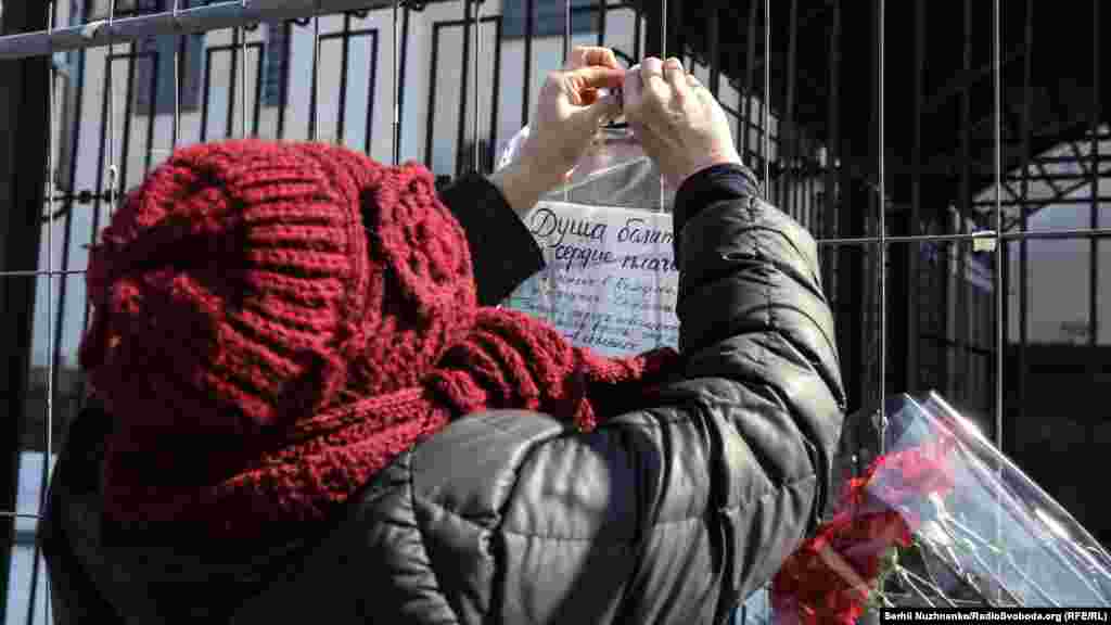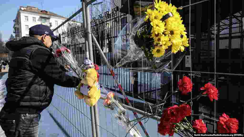 Киевляне несут цветы и игрушки к зданию посольства России в память погибших в трагедии.
