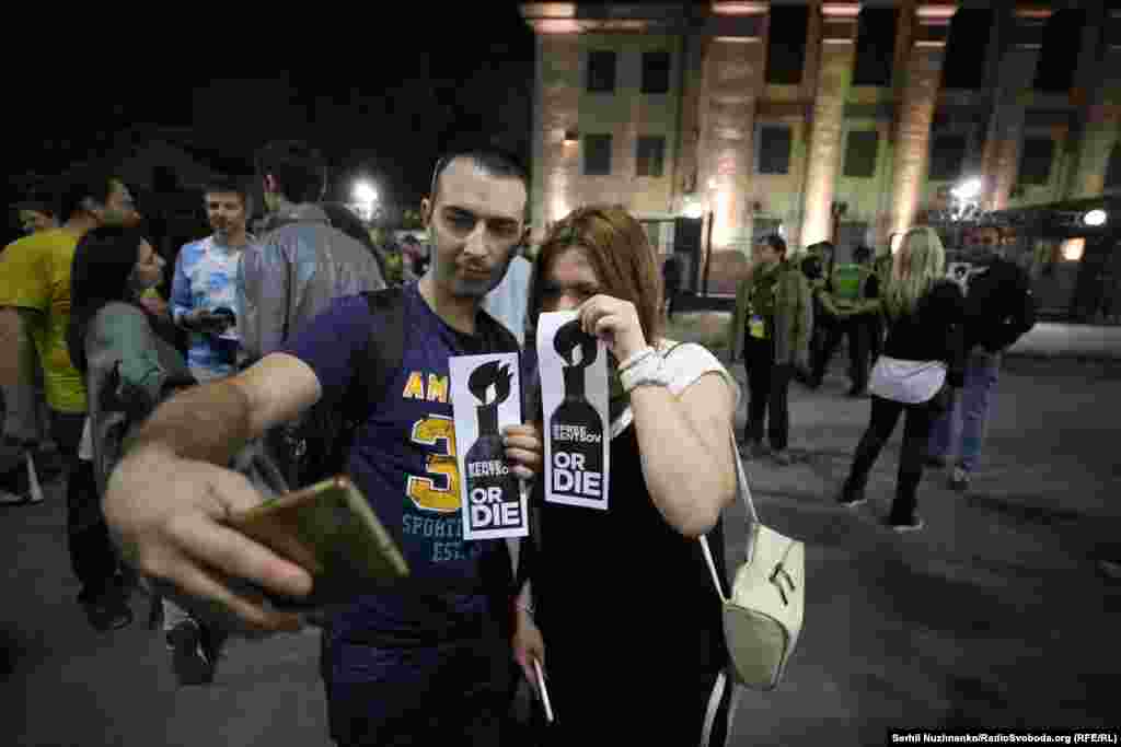 Здание посольства России в Украине в Киеве 25 мая подсветили языками пламени, изображением голодающего в России украинского режиссера Олега Сенцова и других политузников Кремля.