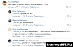 «Сегодня годовщина депортации крымских татар», – уводит обсуждение в сторону Алексей Грек. Некоторые комментаторы возмущаются недоказанными обвинениями коренного народа.