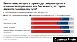 Важнейшим событием 2023 года, по мнению граждан, является рост цен, тарифов ЖКХ и курса валют: об этом говорят 38% опрошенных. Далее с большим отрывом следует объявление Владимира Путина об участии в выборах президента в 2024 году (25%). За этим событием следуют еще два на одном уровне в 22%: это продолжение "специальной военной операции" в Украине (так в России называют развязанную ею войну против Украины – КР) и военный конфликт на Ближнем Востоке. Топ-5 событий замыкает стрельба в российских школах (21% респондентов). Для сравнения: возбуждение уголовных дел за "дискредитацию армии", признание ЛГБТ экстремистской организацией и прочие подобные события упоминают лишь 8% граждан, а антисемитские беспорядки в аэропорту Махачкалы – 5%.