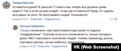 Другие севастопольцы и крымчане обсуждают рекомендацию российских властей оставаться дома. «Оставаться дома? В смысле? С какого мы теперь все должны дома сидеть? Так а если на дом упадёт, тогда где оставаться? Бред. От судьбы все равно не уйти. Не запугивайте людей. Начинается», – возмущается Тамара Кратова.