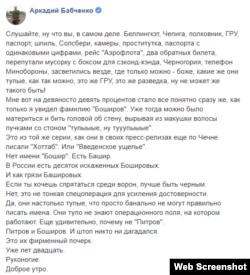«Уже тогда можно было материться и биться головой о стену, срывая с затылка волосы со стоном: «Тупые, ну тупые»... Нет имени «Бошир». Есть «Башир». В России есть десяток искаженных «Боширових». И, как грязи, «Башировых». Если ты хочешь спрятаться среди ворон, лучше быть черным... Странно, почему не «Питров», ‒ отмечает Бабченко.