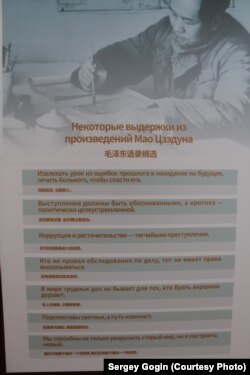 "Мао Цзэдун отдал всю свою жизнь, все силы и энергию Родине и народу, – гласит текст под заголовком "Вождь народа" на одном из центральных плакатов выставки. – Во имя процветания и могущества государства он вел упорную и тяжелую борьбу, выполнял бесчисленное множество важных дел. Во имя великого возрождения китайской нации он, невзирая на трудности, вел исследовательский поиск, предлагал смелые решения. Во имя счастья народа он трудился беззаветно и самоотверженно, боролся до последнего дыхания".