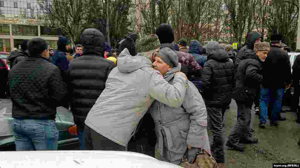 Крымский адвокат Эмиль Курбединов 11 декабря вышел из изолятора временного содержания в Симферополе после отбывания административного ареста. Встречать его пришли десятки активистов. Как сообщает корреспондент Крым.Реалии, собравшиеся говорят, что видели оперативников российского Центра по противодействию экстремизму, которые сидят в машинах неподалеку. Курбединова обвинили в пропаганде либо публичном демонстрировании атрибутики или символики экстремистских организаций за пост в Фейсбуке 2013 года. По словам коллег Курбединова, жалобу на него написал бывший житель Крыма, который переехал в Дамаск. Подконтрольный Кремлю Киевский районный суд арестовал на 5 суток Курбединова 7 декабря.